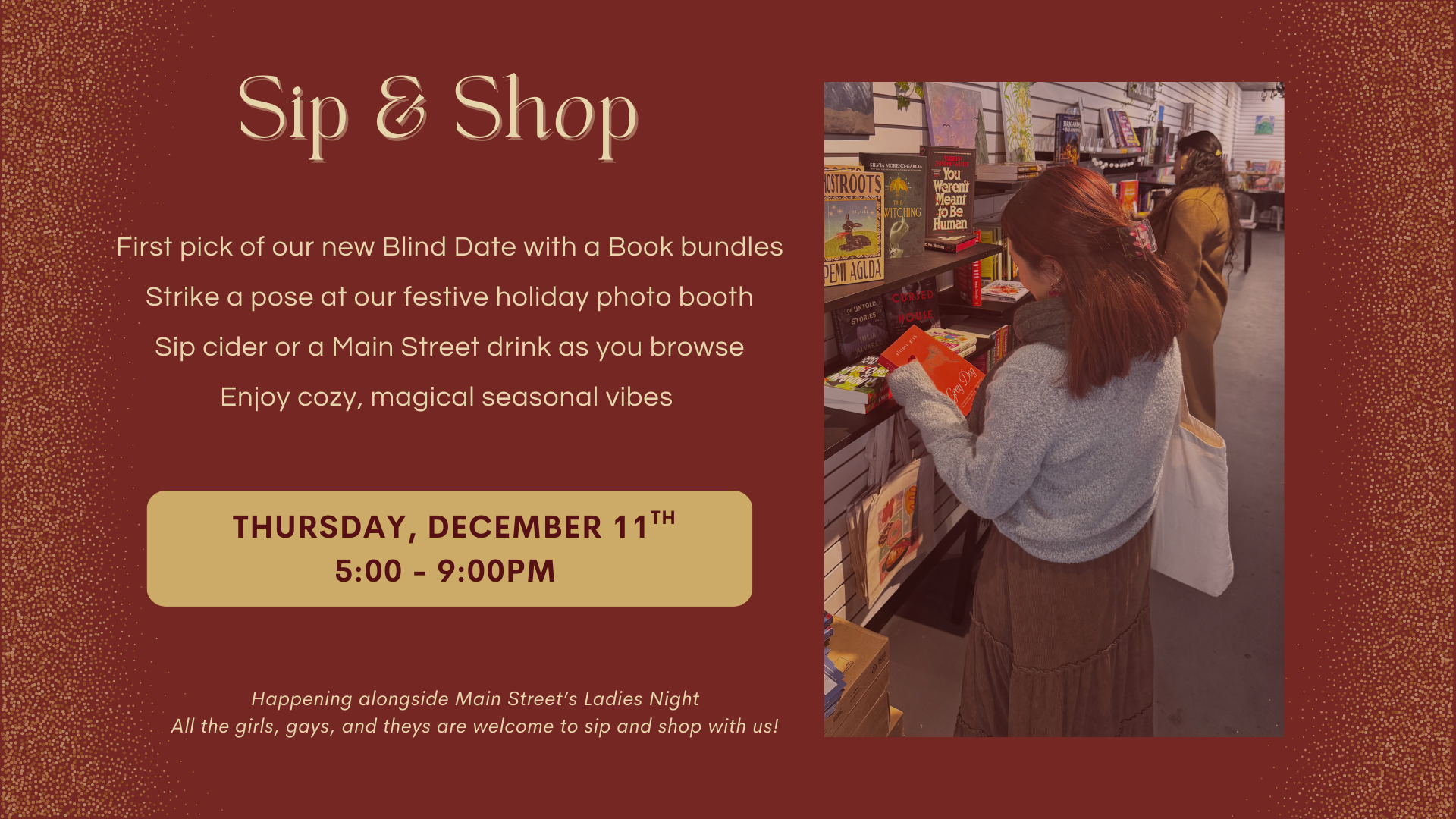 Join us on December 11th from 5–9 PM for some after-hours holiday shopping! Be the first to grab a unique, beautifully curated Blind Date with a Book bundle, strike a pose at our festive photo booth, and soak in the magic of the season — all while sipping cider or a DORA drink from your favorite Main Street bar.
